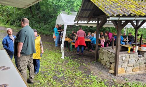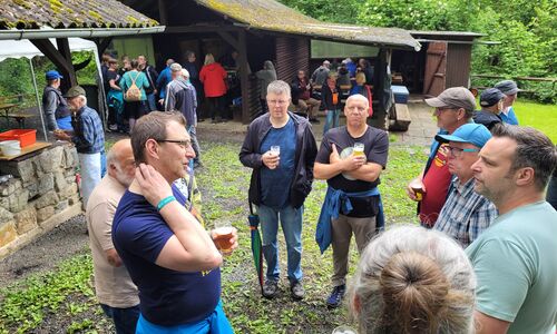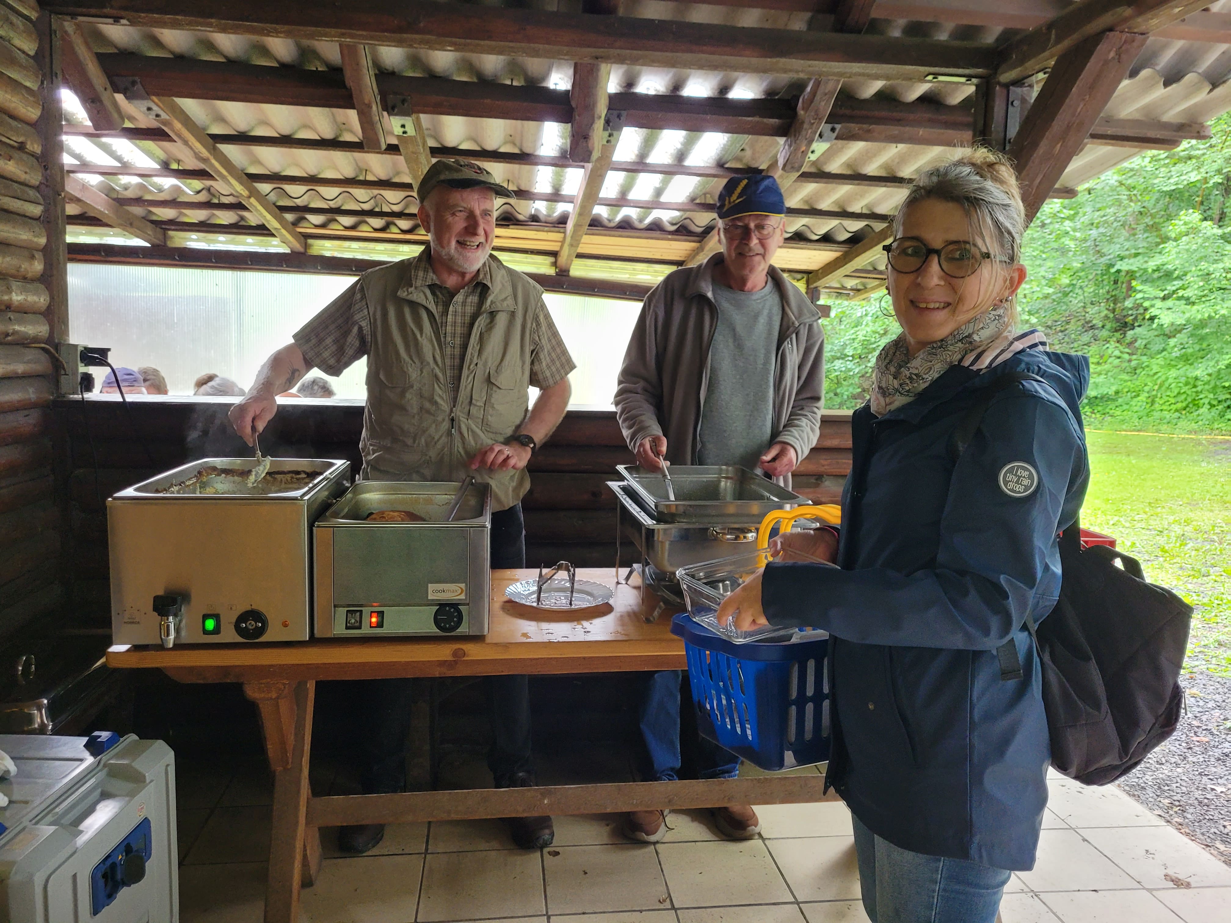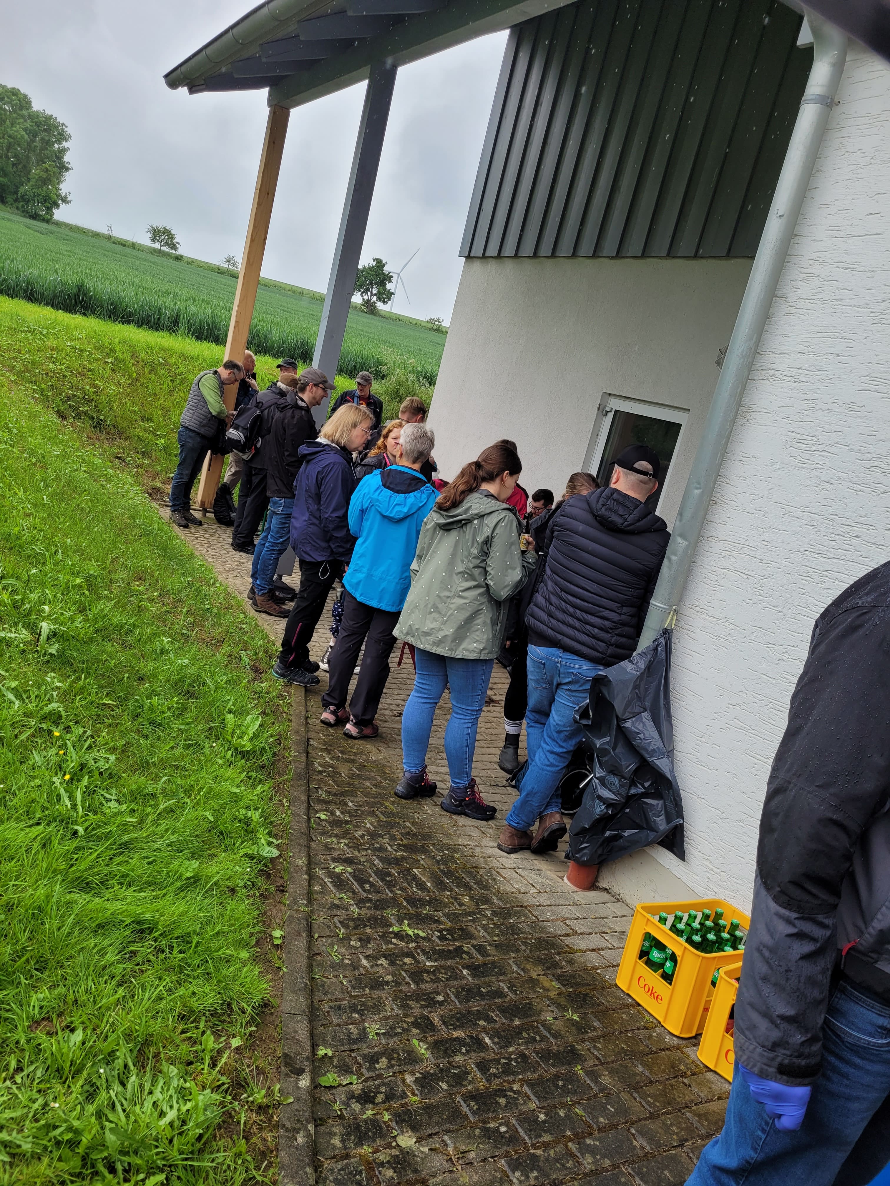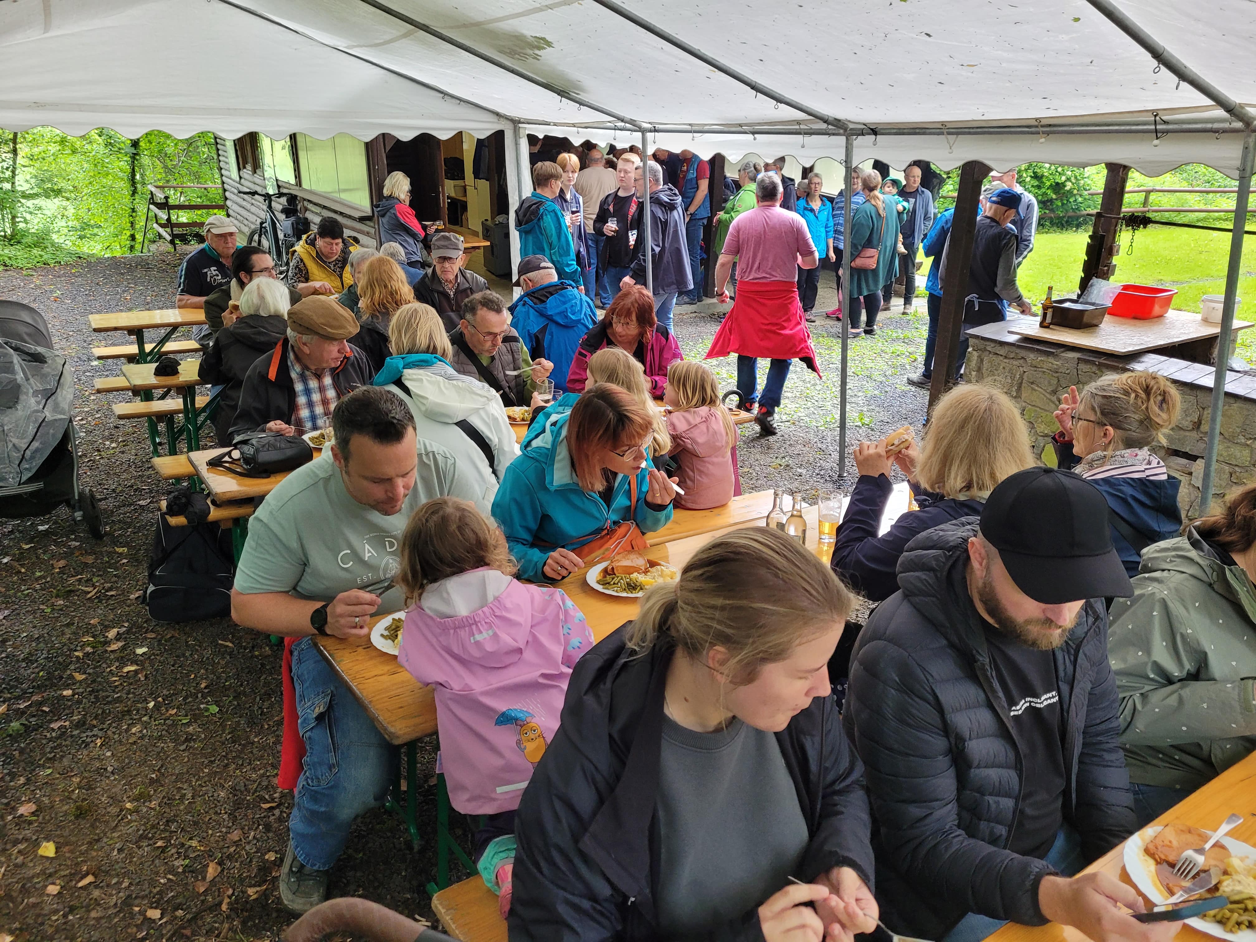 Dem Regenwetter zum Trotz machte sich eine etwas kleinere Wandertruppe als üblich auf den Weg. Die Wanderstrecke führte in diesem Jahr entlang des Waldes über das Gut Hancken nach Grimelsheim mit Raststation. Danach kürzte die Gruppe die ursprünglich geplante Route am Viadukt entlang ab und ging stattdessen direkt zurück nach Haueda und zur Angelhütte. Versorgt wurden die Teilnehmer unterwegs wie gehabt mit leckeren Fisch-, Käse- und Wurstbrötchen sowie gekühlten Getränken bevor an der Angelhütte das Mittagessen wartete.