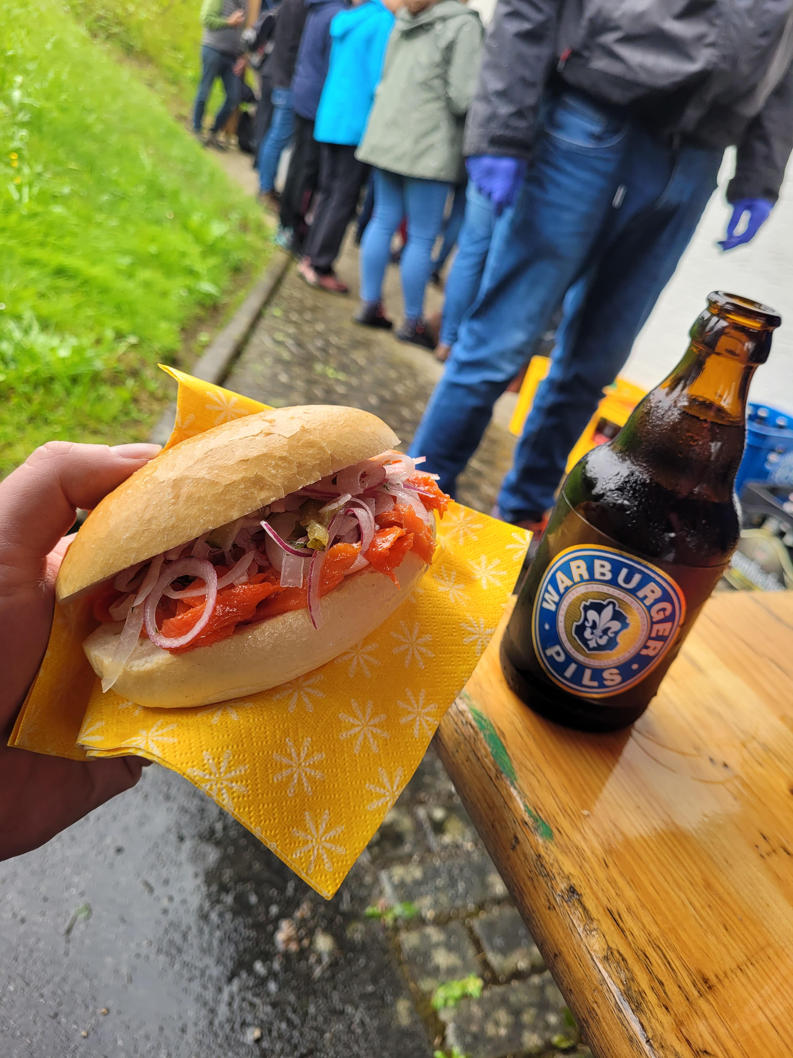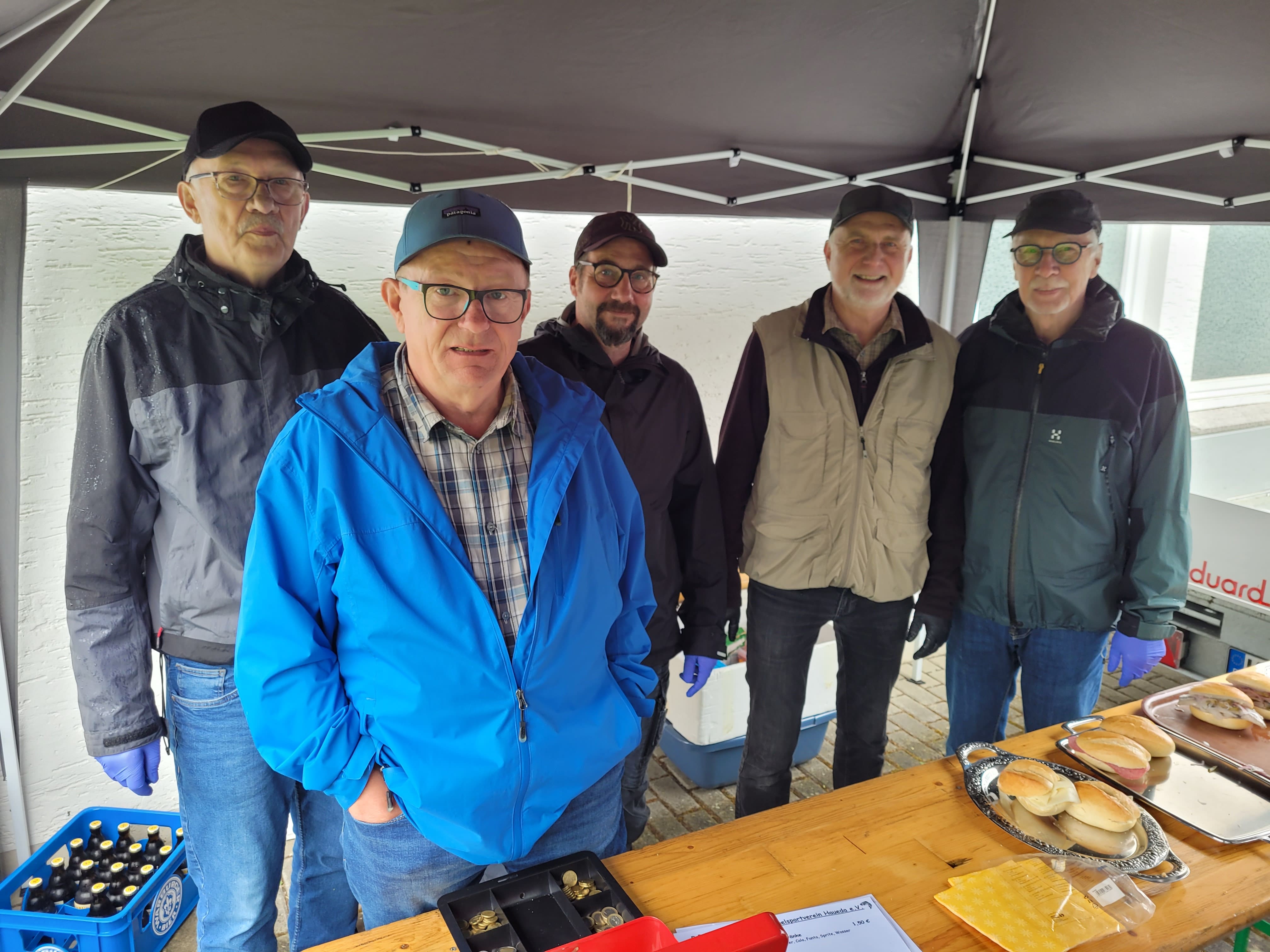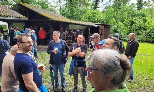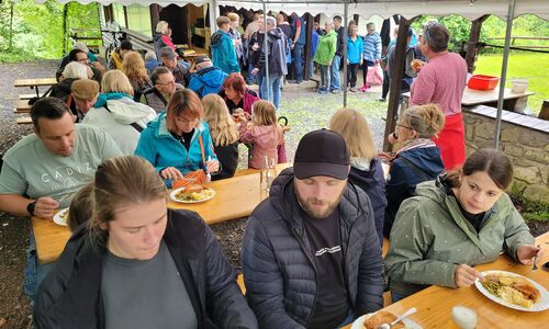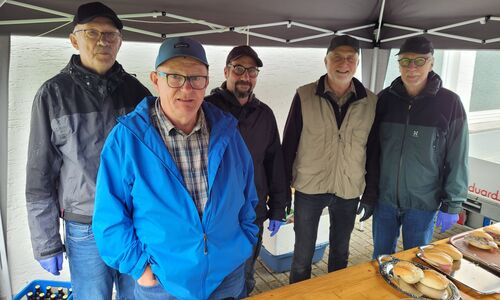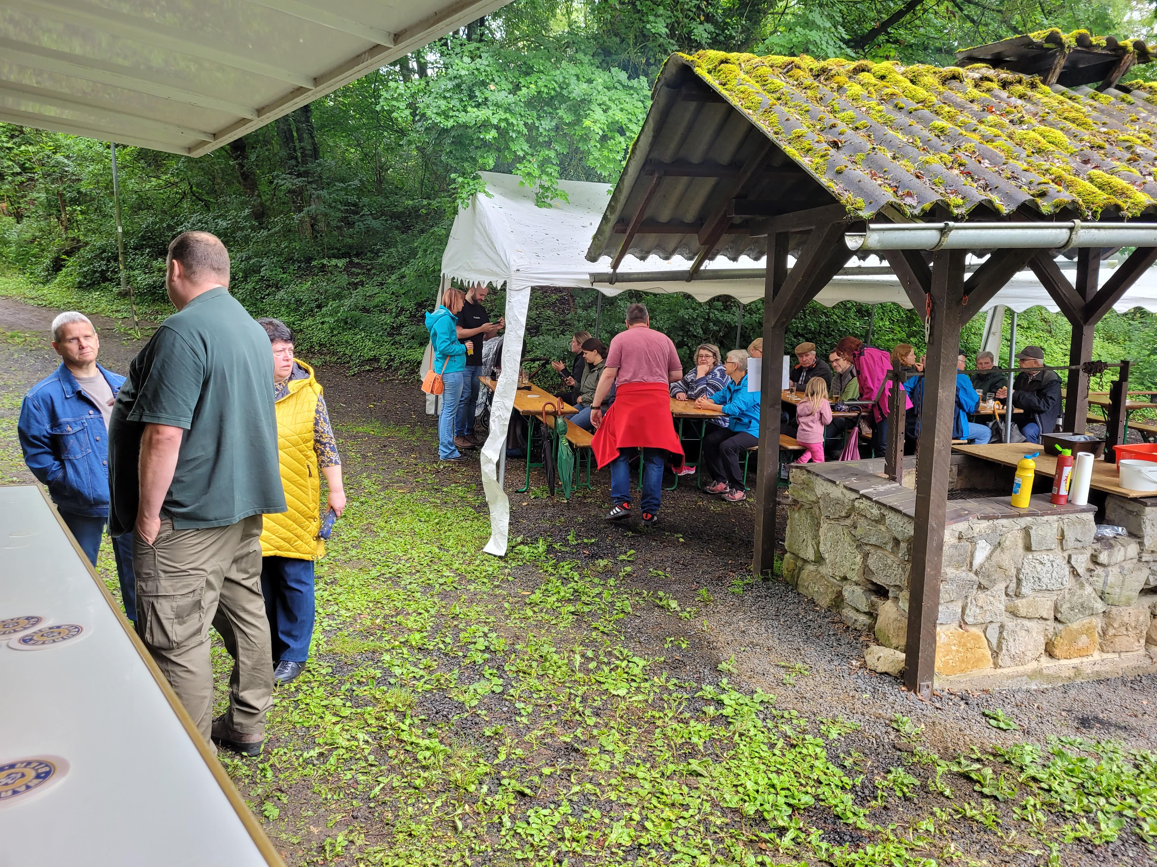 Dem Regenwetter zum Trotz machte sich eine etwas kleinere Wandertruppe als üblich auf den Weg. Die Wanderstrecke führte in diesem Jahr entlang des Waldes über das Gut Hancken nach Grimelsheim mit Raststation. Danach kürzte die Gruppe die ursprünglich geplante Route am Viadukt entlang ab und ging stattdessen direkt zurück nach Haueda und zur Angelhütte. Versorgt wurden die Teilnehmer unterwegs wie gehabt mit leckeren Fisch-, Käse- und Wurstbrötchen sowie gekühlten Getränken bevor an der Angelhütte das Mittagessen wartete.